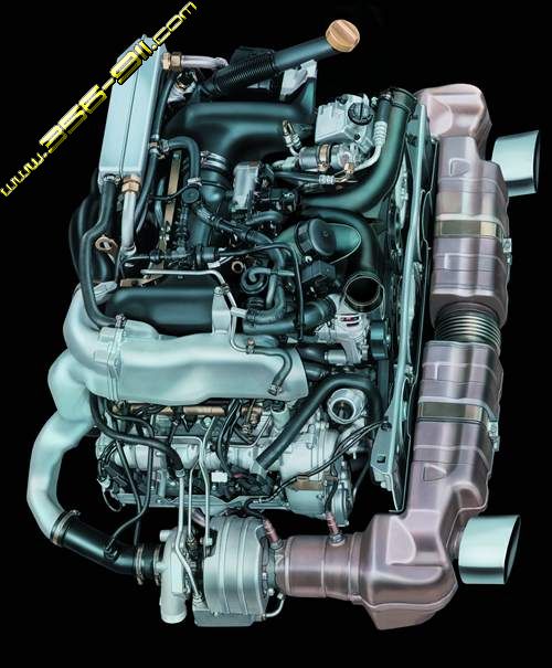 As on the former model,the two turbochargers are arranged in parallel.The small volume of the intake manifold and the short exhaust manifolds ensure a good response.Flowing through a joint air cleaner housing,the intake air goes into the two compressors,from where the compressed air flows through two intercoolers in the wheel arches behind the rear wheels and on to one common duct upstream of the electronic gas pedal.Reverse cooling of the compressed turbocharger air provides a good cylinder charge and keeps the temperatures of the various components to a minimum.The bypass valves are integrated into the turbine housings.Boost pressure is controlled by a joint stroke for the bypass valves masterminded by the engine management.The opening diameter depends on the charge pressure required and is around 1.80 bar at full load,reached at approximately 2700 rpm.Boost pressure is controlled as engine speed increases,and is around 1.65 bar at maximum power.
